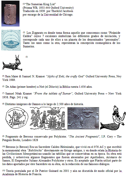 La segunda teoría, que es a la que nos atendremos de aquí en más nosotros, (por parecernos más afin al sentido común digamos, y no con ánimo de polemizar de modo compulsivo y caprichoso.)(11) nos acerca más en el tiempo, y nos sitúa entre los Asirios y Babilonios, y allá por el 1.600 AC. Estos pueblos de la Mesopotamia Asiática son los herederos de los Sumerios en todo lo referente al conocimiento y catalogación de los cielos. Ellos utilizaron una medida de tiempo llamada "Saros", o la que luego pasó con ese nombre a Grecia, y se desparramó por el mundo antigüo hasta llegar a nosotros (aún se utiliza para realizar algunos cálculos astronómicos, sobre todo en la predicción de los eclipses) Y que no solo los astrónomos lo utilizaban, sino que más popularmente era usado para el cálculo de las festividades y las tareas agrícolas. Este "Saros" equivale a un período de 18 años y 11,2 días y es el régimen de lo que se denomina técnicamente "Ciclo de las Anomalías Lunares" (de las que no nos ocuparemos aquí, pero que pueden consultar sobre ellas en sus clases de Astronomía y Astrología, ya que son los ciclos que siguen los Nodos Lunares). Sucede aquí pues, un caso lingüistico parecido aunque inverso al de la Teoría anterior, ya que hay aquí una palabra "técnica" Asiriobabilónica posterior, pero que muy, y digo muy muy, probablemente fue heredada de los Sumerios junto con todo su conocimiento Astronómico, y que se deformó por el uso, a lo largo del trascurso de todos esos 3.000 años... Según esta teoría, estaríamos hablando de una cifra aproximada a los 2.220 años(5) para los 120 Sarem, lo que ya me suena bastante bién si nos atenemos a la evidencia arqueológica encontrada en Eridú, porque esto nos situaría allá por el 4.000 AC más o menos, o sea, hace ya unos seis mil años si hablamos en números redondos... Bien, aclarado entonces el asunto de los números, volvamos a donde estabamos, allí con don Oannes y su extravagante aspecto.